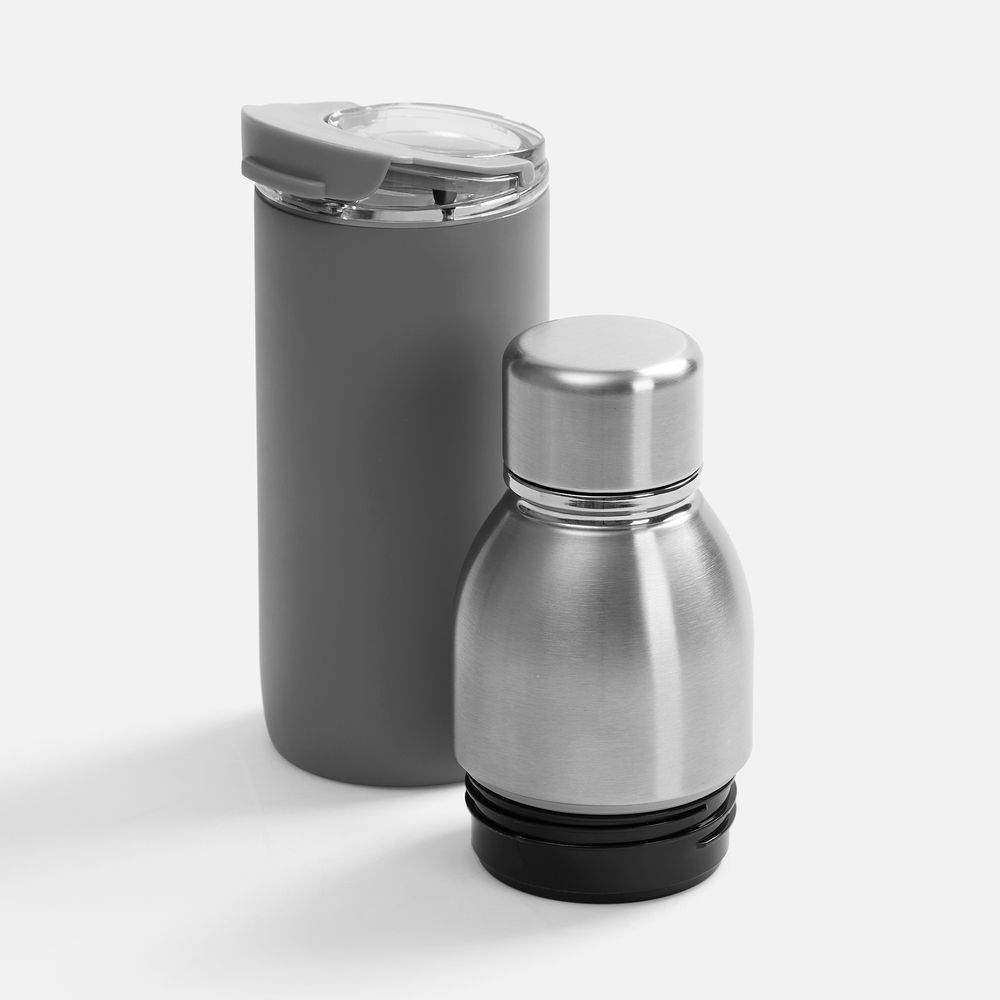 Varianti — это яркий пример посуды с двойной функциональностью. Один и тот же корпус можно превратить как в термостакан для чая и кофе с пластиковой крышкой, так и в термобутылку для прохладительных напитков со стальной крышкой.