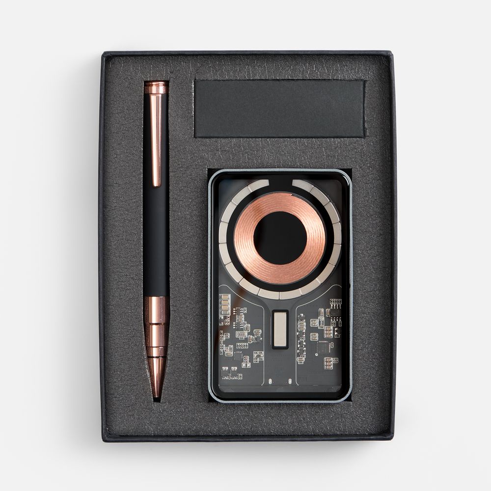 Компактный аккумулятор Cooper Ergo с премиальным корпусом и привлекательной электронной «начинкой» под прозрачной панелью в сочетании с увесистой шариковой ручкой Kugel Rosegold станут идеальным подарком как для коллег, так и для руководителей.