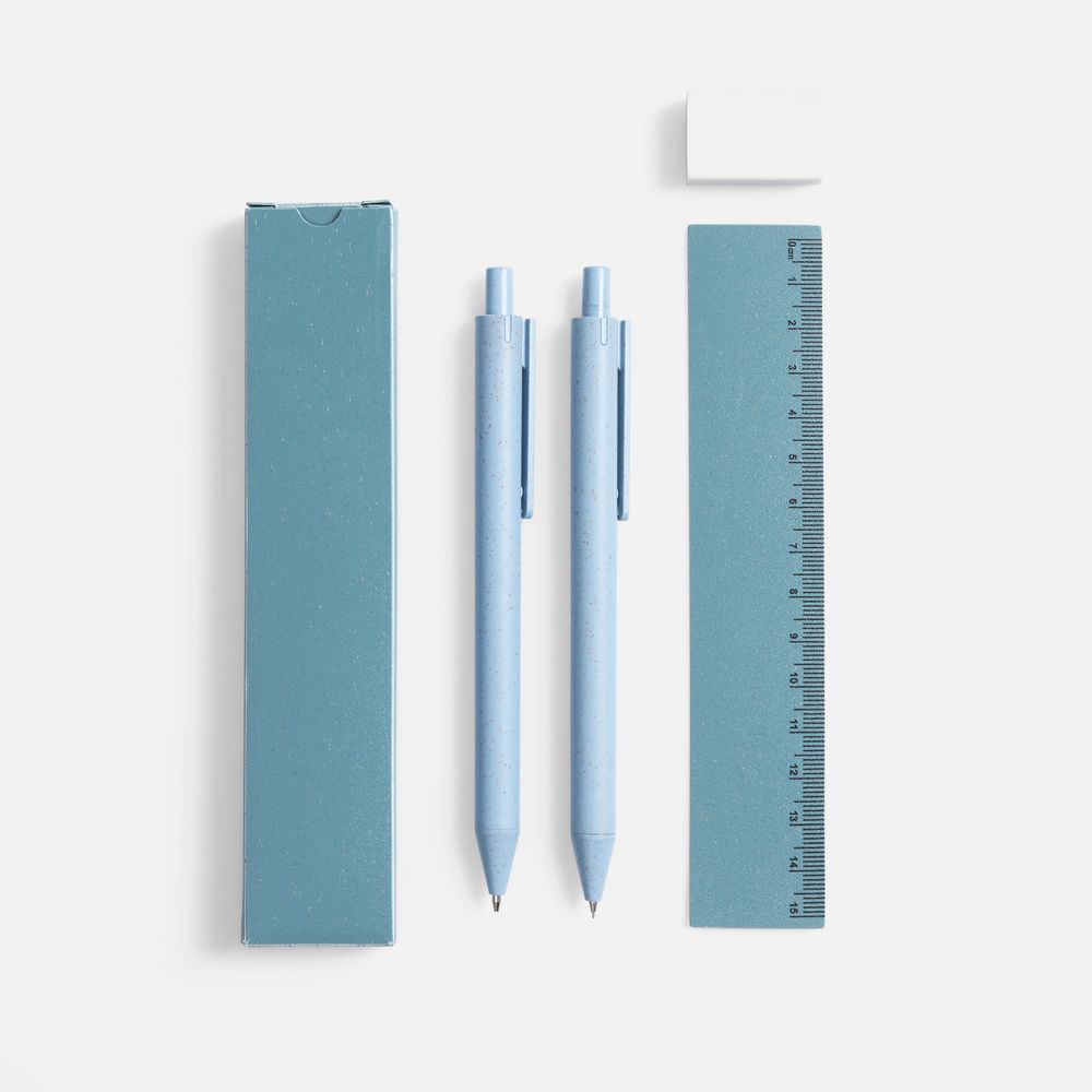 Ручка, механический карандаш, ластик и линейка в коробочке, которая может служить компактным пеналом. Весь набор, включая упаковку, выполнен из пластика, изготовленного с добавлением пшеничных волокон.