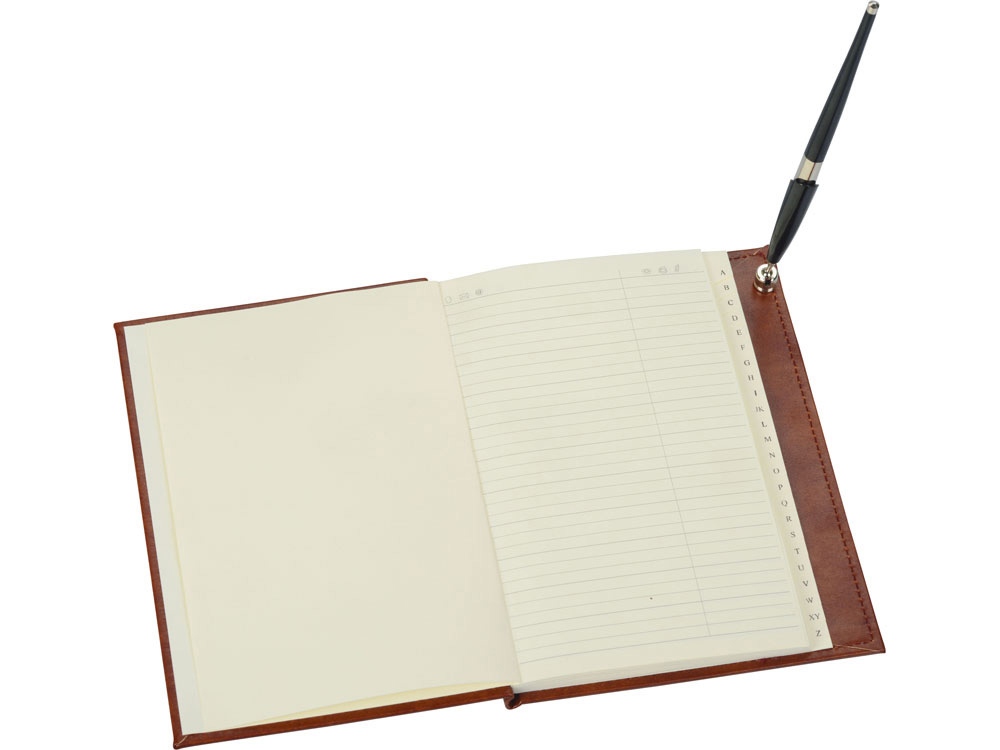 Оригинальный настольный прибор состоит из записной книжки и ручки. Обложка блокнота оснащена держателем для ручки и задекорирована изысканным украшением. Прибор станет настоящей настольной книгой руководителя.