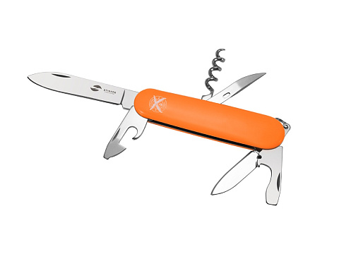 Нож перочинный STINGER имеет 11 функций: 1. Большое лезвие 2. Малое лезвие 3. Консервный нож с: 4. - Малой отверткой 5. Штопор 6. Шило с: 7. - Иглой 8. Открывалка для бутылок с: 9. - Отверткой 10. - Инструментом для снятия изоляции 11. Кольцо для ключей ХАРАКТЕРИСТИКИ Материалы • лезвие/инструменты: нержавеющая сталь 420, твердость 44-48 HRC • рукоять: нержавеющая сталь 420, твердость 44-48 HRC • накладки рукояти: АБС-пластик Размеры • Размеры ножа: 90х26,5х14 мм • Общая длина: 160,4/131,3 мм • Длина клинка: 67,8/40,4 мм • Наибольшая ширина клинка: 12,4/9,4 мм • Толщина обуха: 2,5/1,5 мм • Длина рукояти: 92,6/90,9 мм • Ширина рукояти (в ср.части): 20,6 мм • Толщина рукояти (в ср.части): 15 мм Вес: 80 г Цвет накладок рукояти: оранжевый Накладки рукояти ножа не подлежат замене. Упаковка: картонная коробка
