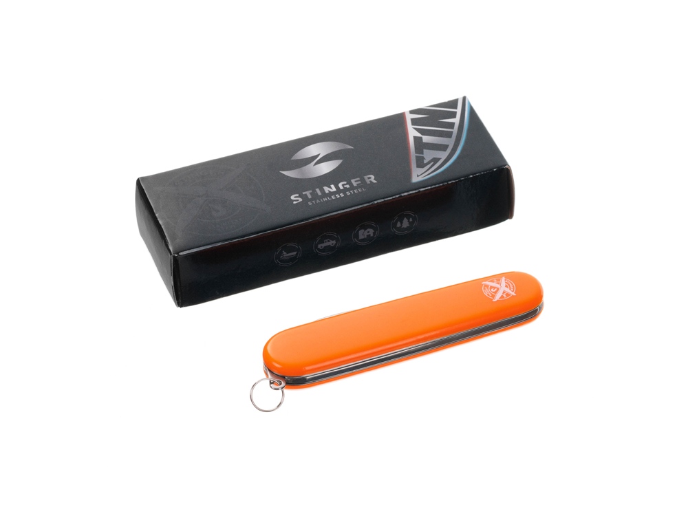 Нож перочинный STINGER имеет 2 функции: 1. Лезвие 2. Кольцо для ключей ХАРАКТЕРИСТИКИ Материалы • лезвие/инструменты: нержавеющая сталь 420, твердость 44-48 HRC • рукоять: нержавеющая сталь 420, твердость 44-48 HRC • накладки рукояти: АБС-пластик Размеры • Размеры ножа: 90х26,5х14 мм • Общая длина: 160,1 мм • Длина клинка: 67,5 мм • Наибольшая ширина клинка: 12,3 мм • Толщина обуха: 2,5 мм • Длина рукояти: 92,6 мм • Ширина рукояти (в ср.части): 20,3 мм • Толщина рукояти (в ср.части): 12,1 мм Вес: 50 г Цвет накладок рукояти: оранжевый Накладки рукояти ножа не подлежат замене. Упаковка: картонная коробка