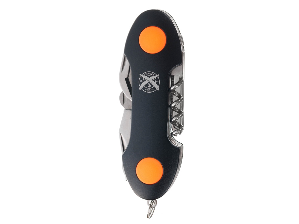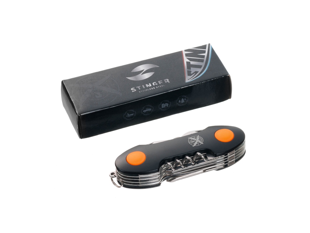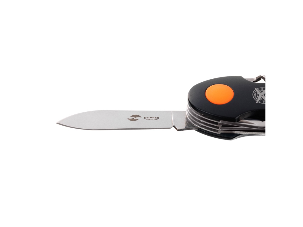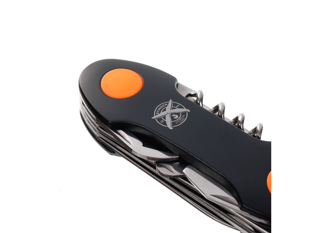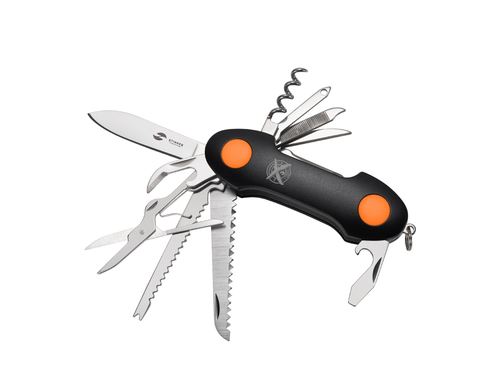 Нож перочинный STINGER имеет 15 функций: 1. Большое лезвие 2. Пила по дереву 3. Инструмент для чистки рыбы с: 4. - Инструментом для извлечения рыболовного крючка 5. Ножницы 6. Консервный нож 7. Открывалка для бутылок с: 8. - Отверткой 9. Крестовая отвертка 10. Ледокол 11. Пилка для ногтей с: 12. - Инструментом по уходу за ногтями 13. Игла 14. Штопор 15. Кольцо для ключей Материалы • лезвие/инструменты: нержавеющая сталь 420, твердость 44-48 HRC • рукоять: нержавеющая сталь 420, твердость 44-48 HRC • накладки рукояти: алюминий, полипропилен Размеры • Размеры ножа: 95х30х20 мм • Общая длина: 156,7 мм • Длина клинка: 60,1 мм • Наибольшая ширина клинка: 11,9 мм • Толщина обуха: 1,7 мм • Длина рукояти: 96,6 мм • Ширина рукояти (в ср.части): 24,7 мм • Толщина рукояти (в ср.части): 21,7 мм Вес: 139 г Цвет накладок рукояти: черный, оранжевый Накладки рукояти ножа не подлежат замене. Упаковка: картонная коробка