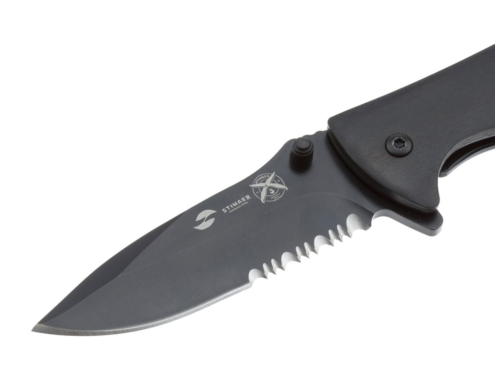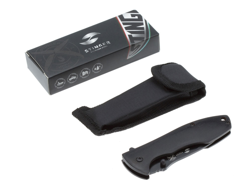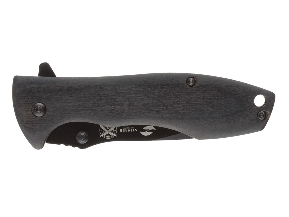 НОЖ СКЛАДНОЙ STINGER Материал лезвия: нержавеющая сталь марки 3Cr13 Материал рукояти: сталь + дерево пакка Фиксатор лезвия: Frame Lock Длина ножа: 185 мм Длина клинка: 80 мм Толщина клинка: 3 мм Вес: 112 г Цвет рукояти: чёрный с древесным узором Особенности: с серрейторной кромкой, клипом и отверстием под темляк Метод открывания клинка: шпенёк (подпальцевый упор на лезвии) В комплекте: нейлоновый чехол