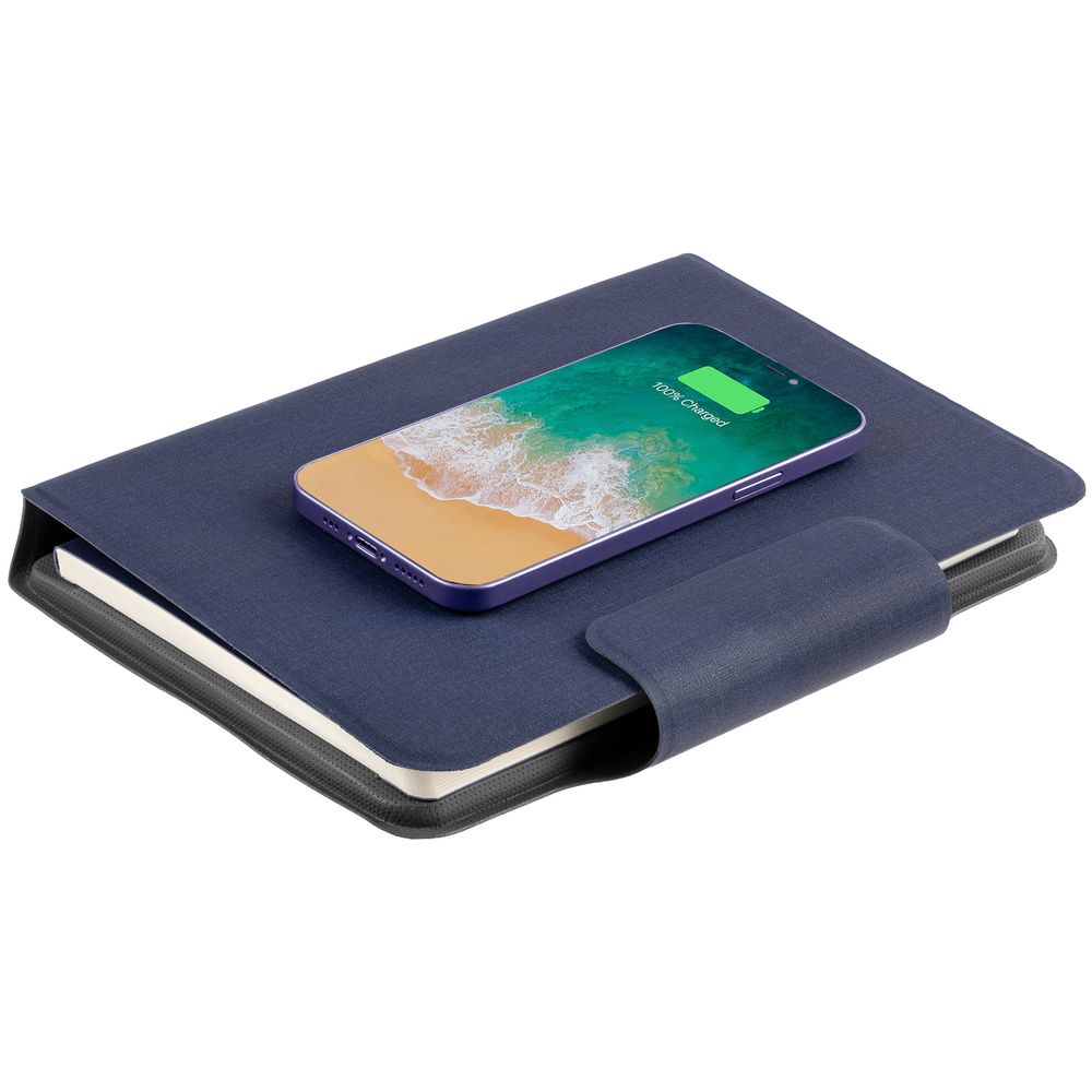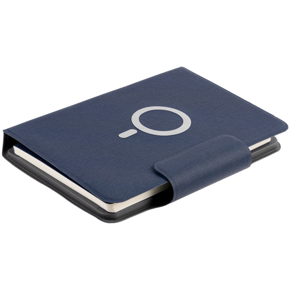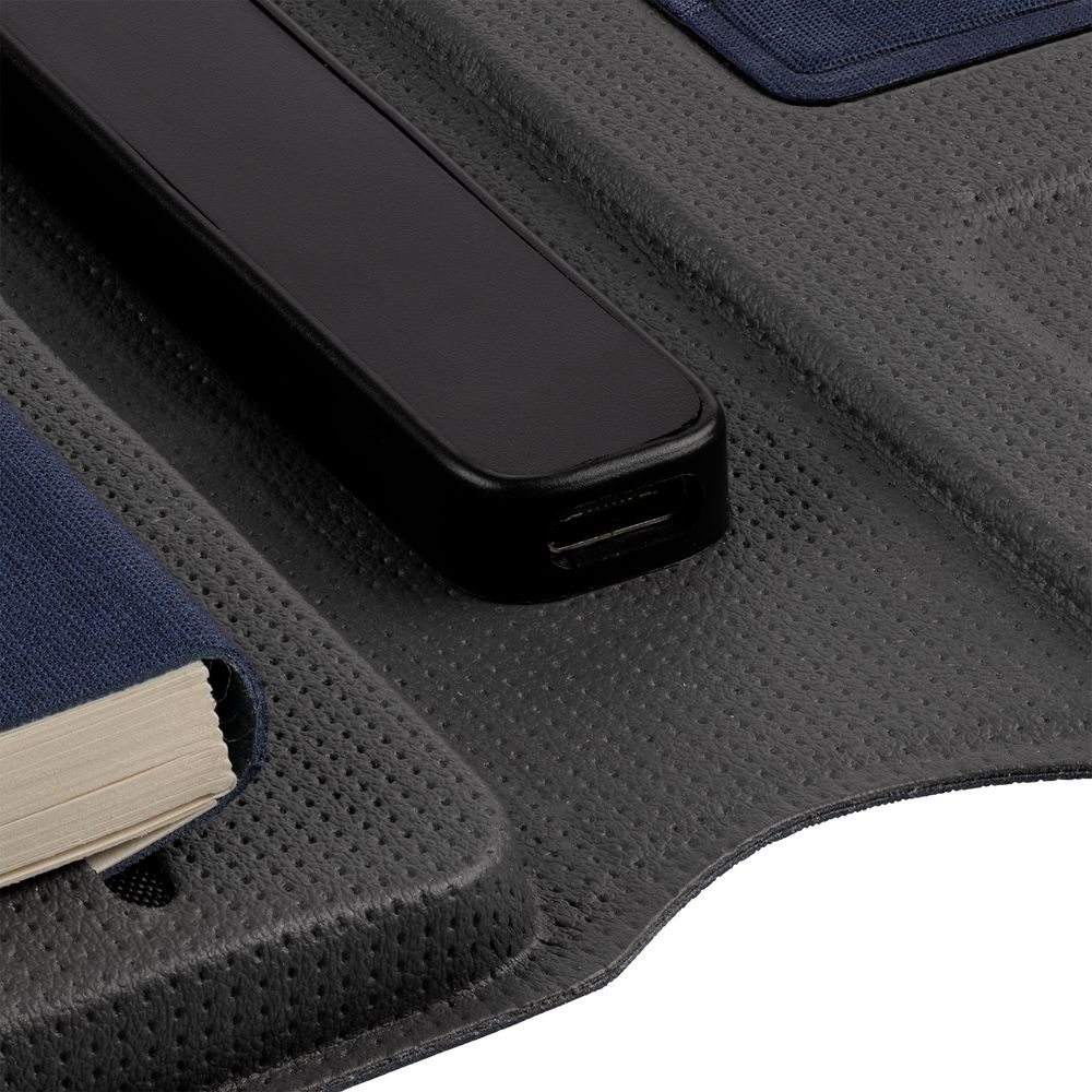 Органайзер с блокнотом и аккумулятором с беспроводной зарядкой. Обложка с фактурой, имитирующей ткань, на магнитной застежке.