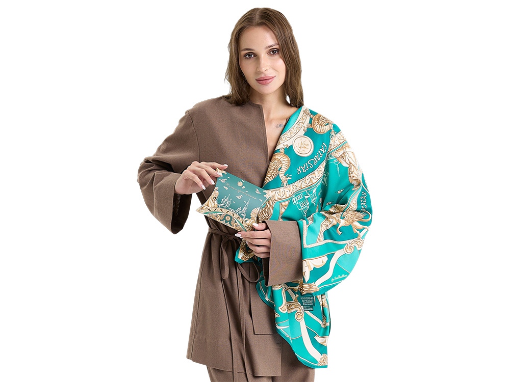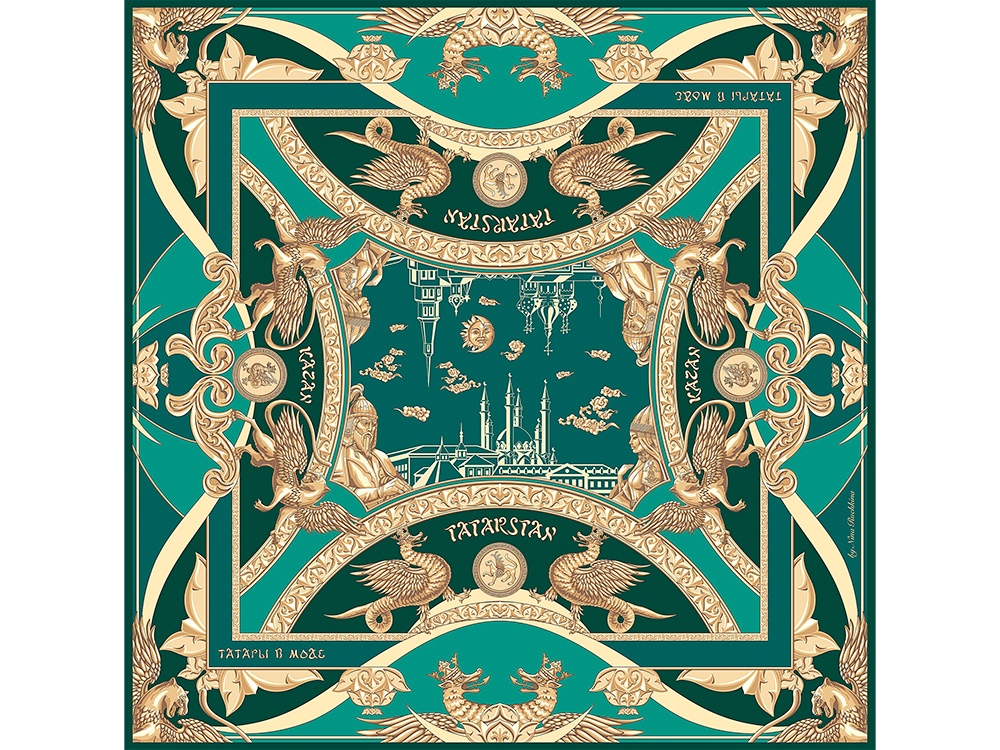 Казань – столица Республики Татарстан, третья столица Российской Федерации, один из крупнейших религиозных, экономических,образовательных, культурных и спортивных центров России. Казань-это город с богатой, многовековой историей, многообразие его культурного наследия привлекает туристов со всего мира! Столицу Татарстана традиционно называют мультикультурной, здесь бок о бок соседствуют мечеть и православный храм, прослеживается смешение религии, ментальности и истории Востока и Запада. В центре композиции раскинулся величественный ансамбль легендарного Казанского Кремля, объект Всемирного наследия ЮНЕСКО, в составе которого отчетливо просматривается Мечеть Кул-Шариф, Благовещенский Собор и Башня Сююмбике. Панорама заключена в золотую рамку с татарским национальным узором, по углам которой мы видим образы любимой царицы казанских татар — Сююмбике и собирательный образ казанского Хана – символа доблести, отваги и мужества. Немаловажное место в общем решении платка занимает Коронованный дракон Зилант— официальный символ, изображенный на гербе города Казани. Крылатый барс как — Бог плодородия и покровитель детей, изображение которого присутствует на государственном гербе Республики Татарстан идеально вписывается в общую композицию. На платке барс изображен в виде золотой скульптуры, как и Зилант, это придает платку сказочности, волшебства и царственности. Над дизайном работали художники: Нина Ручкина, Александра Гринева.