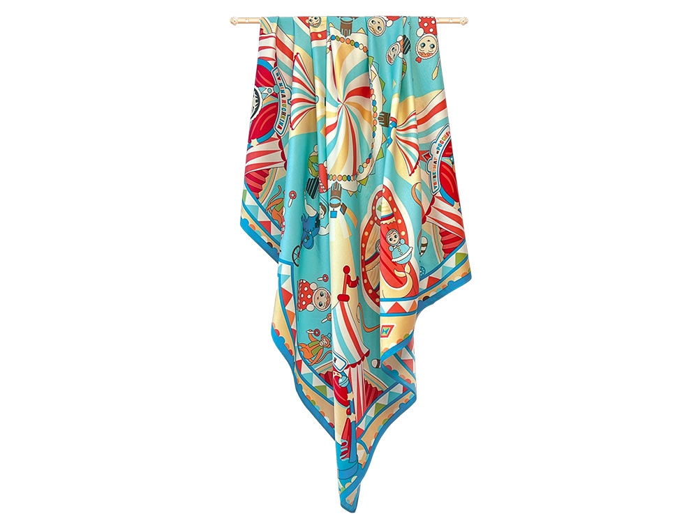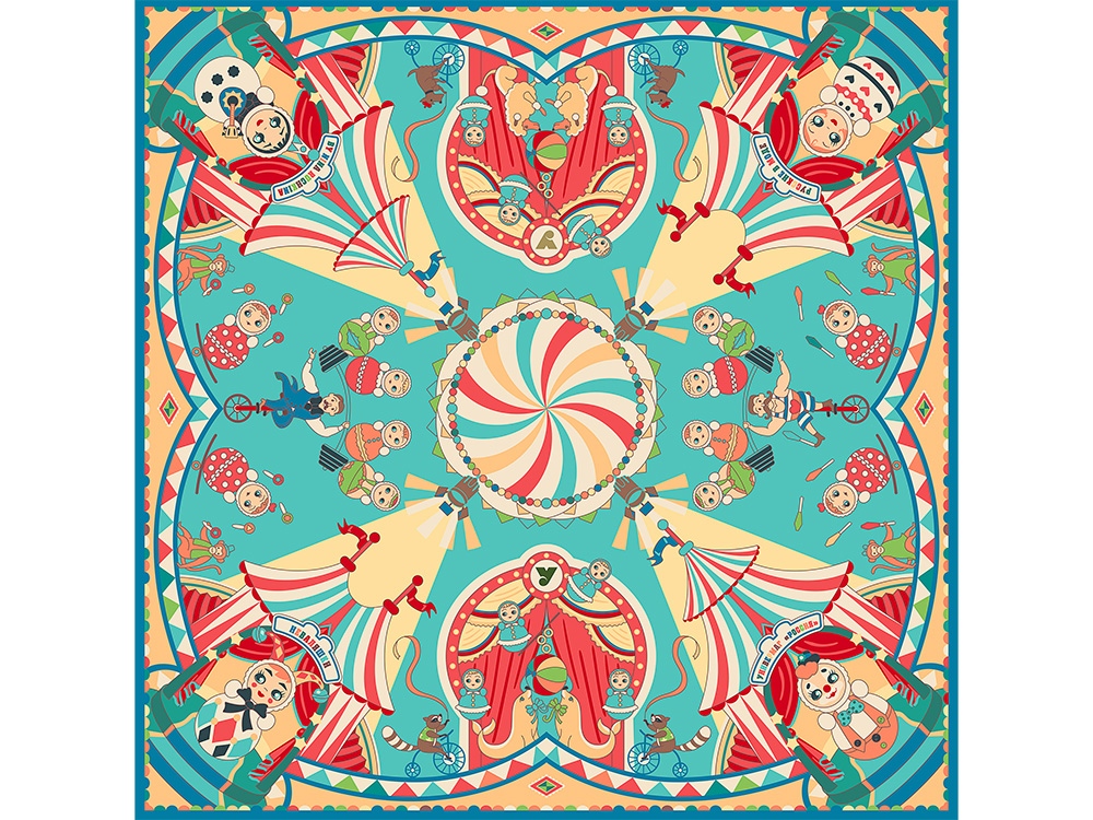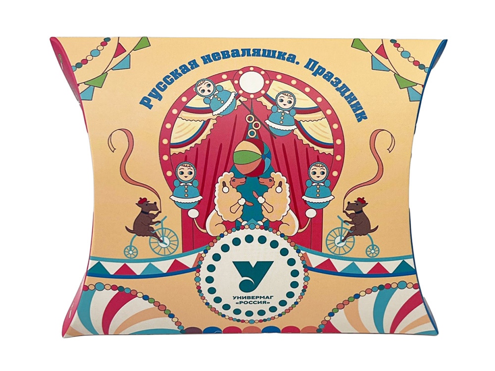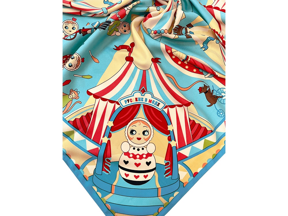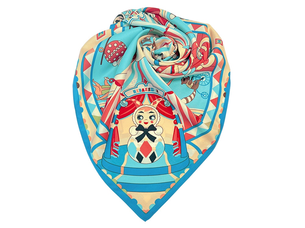 Яркая неваляшка – символ России – неизменно возвращает нас в мир детства, радости и безграничного оптимизма. Знаменитая игрушка стала метафорой, олицетворяющей стойкий русский характер, в котором несгибаемая сила духа сочетается с гостеприимством и радушием. На полотне воплощена добрая атмосфера народного веселья и волшебства, где каждый рисунок напомнит о сказках, ярмарках и лубочных иллюстрациях. В центре лучится купол цирка, разноцветный словно леденец, а вокруг раскинулись нарядные шатры. В свете софитов запечатлены расписные образы игрушек, зверей, эквилибристов и силачей – уникальные и неповторимые, они образуют кружащийся танец. Прикоснитесь к традициям России вместе с изысканным платком Русская неваляшка. Праздник, который подчеркнет Вашу индивидуальность, поднимет настроение или станет ценным подарком! Над дизайном работали: Нина Ручкина, Ирина Цыбина, Анна Тумашова.