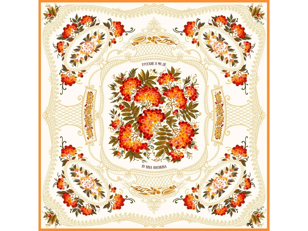 Бренд Русские в моде от дизайнера Нины Ручкиной с гордостью представляет дизайн платка Тагильский поднос. Нижний Тагил - крупнейший промышленный центр Урала, является родиной русского расписного железного подноса. Искусство уральской лаковой росписи, зародившееся в 40-е годы XVIII столетия и активно развивающееся в XXI, обогатило художественную культуру России. В нем воплотился сплав высокого профессионального мастерства, кропотливого труда художников по металлу, стремление к прекрасному и талант народных живописцев. Русская рябина - излюбленный сюжет мастеров тагильского подноса. Она абсолютно уникальна и узнаваема. Эскиз платка дополнят утонченная вязь орнаментов и ажурные решетки, присущие исключительно этому промыслу. Платок Тагильский поднос станет ярким акцентом в вашем гардеробе. Насыщенная терракотово-чёрная цветовая гамма плодов всегда актуальна, а нежные оттенки цветов рябины внесут настроение романтичности и легкости. Дизайнеры: Нина Ручкина и Анна Шулик