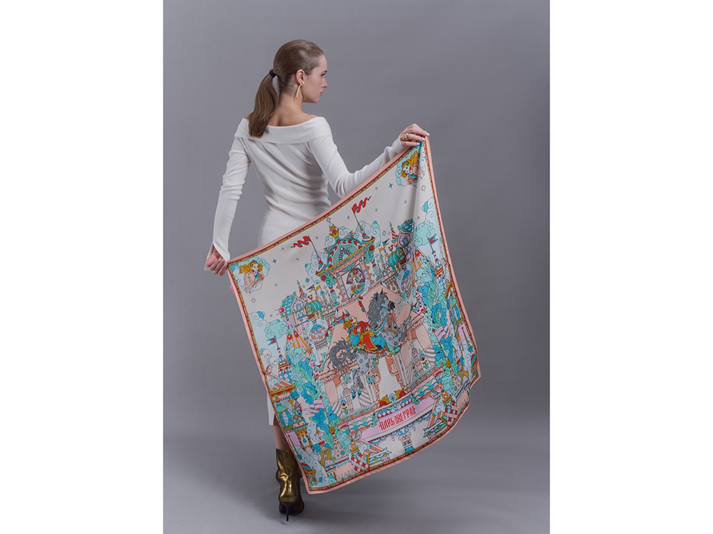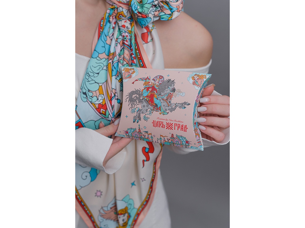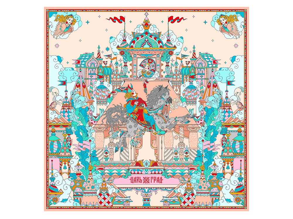 Платок Царьград создан в партнерстве с одноименным загородным курортом, где чтут лучшие обычаи русского гостеприимства. Дизайн платка обращен к воплощению народной традиции чародейства и сказки. Сюжет иллюстрирует фольклорную сцену из произведения Сивка-Бурка о победе истинного чувства и исполнении желаний. Перед нами возвышается волшебный терем Царьграда с разноцветными башнями, расписными столпами, диковинными растениями. Иван, преодолев все испытания, на резвом коне устремлен к прекрасной царевне. Все в Царьграде наполнено атмосферой радости и праздника для свершения чудес! Платок выполнен с любовью в русском стиле. Царьград отличают яркий колорит, тонкая художественная работа и настроение настоящей сказки! Над дизайном работали: Нина Ручкина, Мила Лосенко.