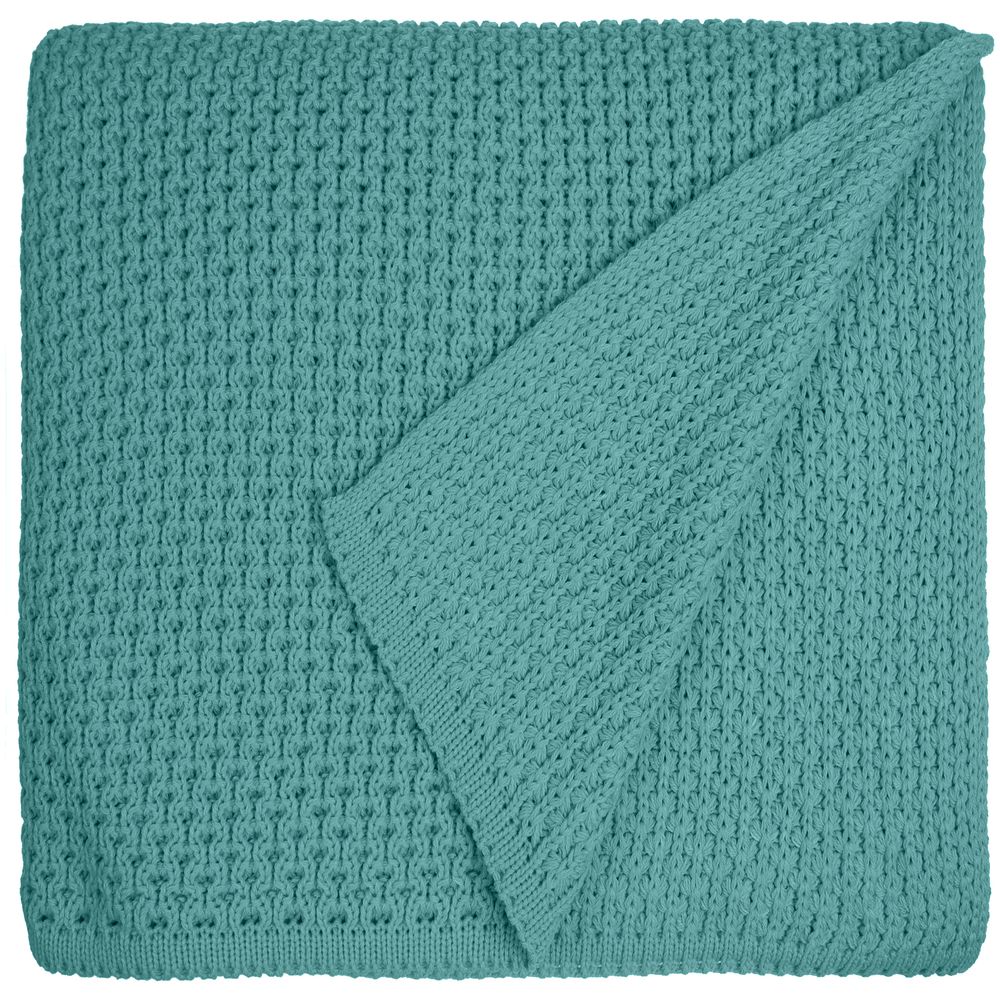 Плед с вывязанным логотипом и рельефным узором в фирменном цвете компании.