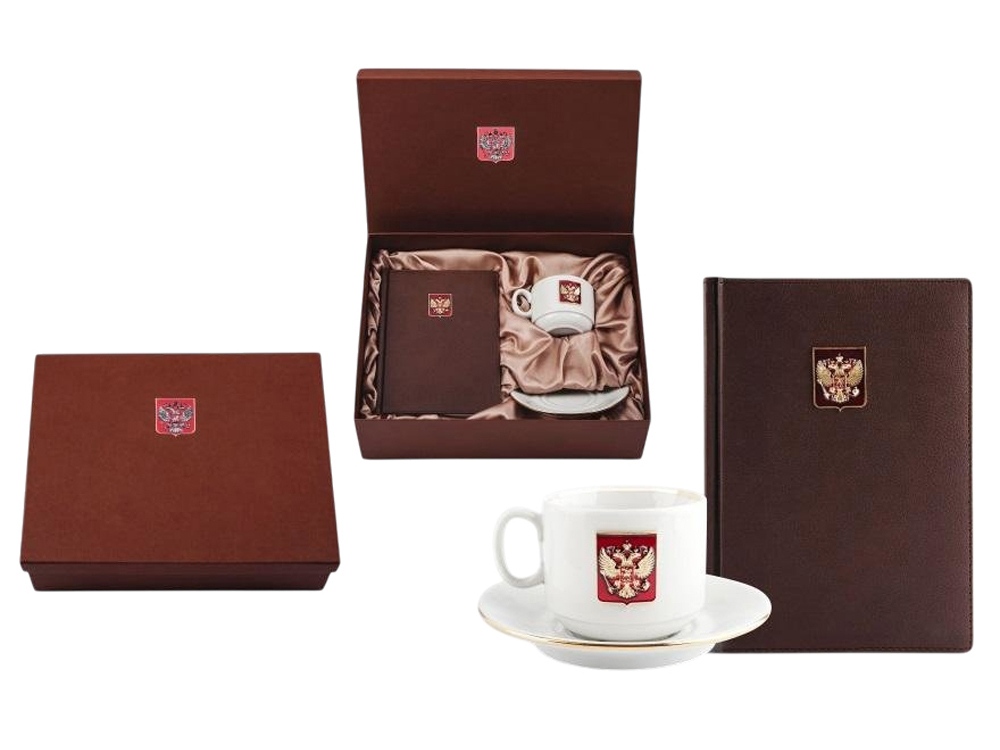 Подарочный набор с ежедневником и чайной парой. Ежедневник формата А5 с декором Герб РФ на щите и фарфоровая чайная пара с золотой отводкой края чашки и блюдца декорированная металлическим барельефом Двуглавый орел. Материал барельефа сплав алюминия с декоративным покрытием под серебро и отделкой эмалью, материал ежедневника кожзам. Емкость чашки 220 мл. Ручная работа. Подарочная упаковка.