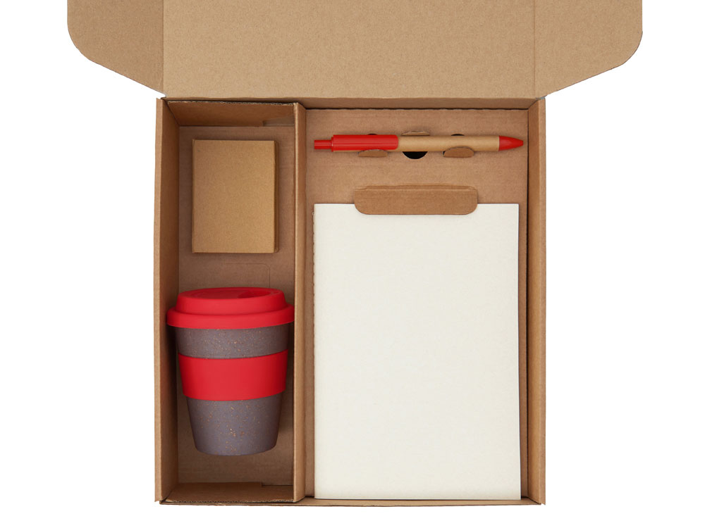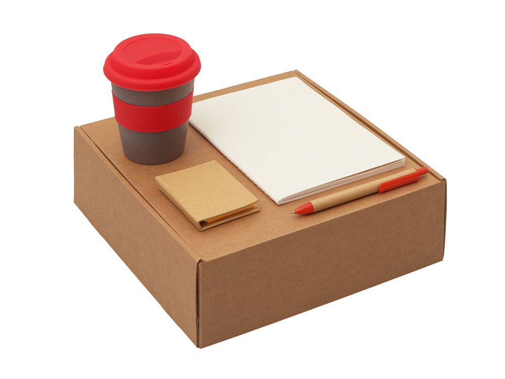 | Материал товара | блокнот- бумага из переработанных тетра-паков, ручка- картон, пластик, стакан- 50% бамбуковое волокно, 50% полипропилен, коробка- картон |
