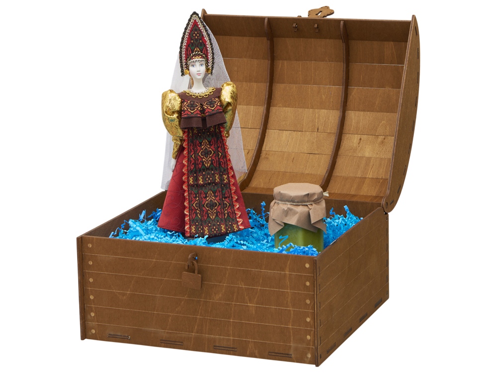 Очарование русских традиций, домашнего уюта и изысканных вкусов соединилось в этом уникальном подарке. Набор создан для тех, кто ценит подлинную красоту и желает подарить незабываемые эмоции. Что внутри: - Фарфоровая кукла в народном костюме ручной работы: расписной сарафан и кокошник с традиционной вышивкой воссоздают образ русской красавицы. - Крем-мёд с лаймом и имбирём (250 г): нежная текстура с яркой цитрусовой ноткой и тёплым имбирным оттенком. Изысканное лакомство для истинных гурманов. - Элегантное оформление: декоративная стружка придаёт композиции глубину и благородство, бережно сохраняя все элементы набора. Роскошная упаковка: деревянный сундук с изящным замочком превращает вручение подарка в особый ритуал. Дополнительное брендирование шильдом спектрум делает презент эксклюзивным и памятным. Идеальный выбор для тех, кто ищет не просто сувенир, а настоящее произведение искусства с русской душой.