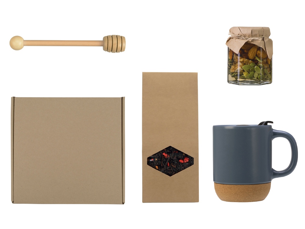 Материал товара кружка - керамика, пробка, мед в банке - стекло, ложка - бамбук, чай - крафт-коробка, коробка - картон