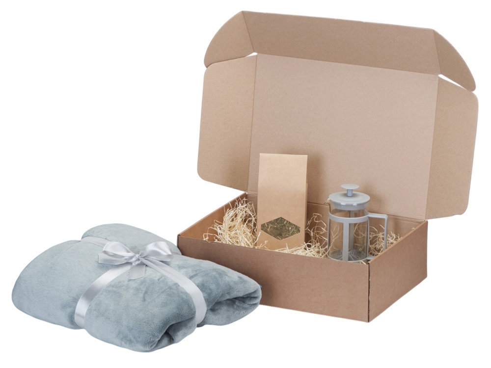Набор продуман до мелочей. Когда зимним вечером подходит время чая, хочет завернуться в мягкий и теплый плед и наслаждаться любимым напитком, который можно заварить во френч прессе, входящем в комплект. Набор упакован в стильную крафтовую коробку.