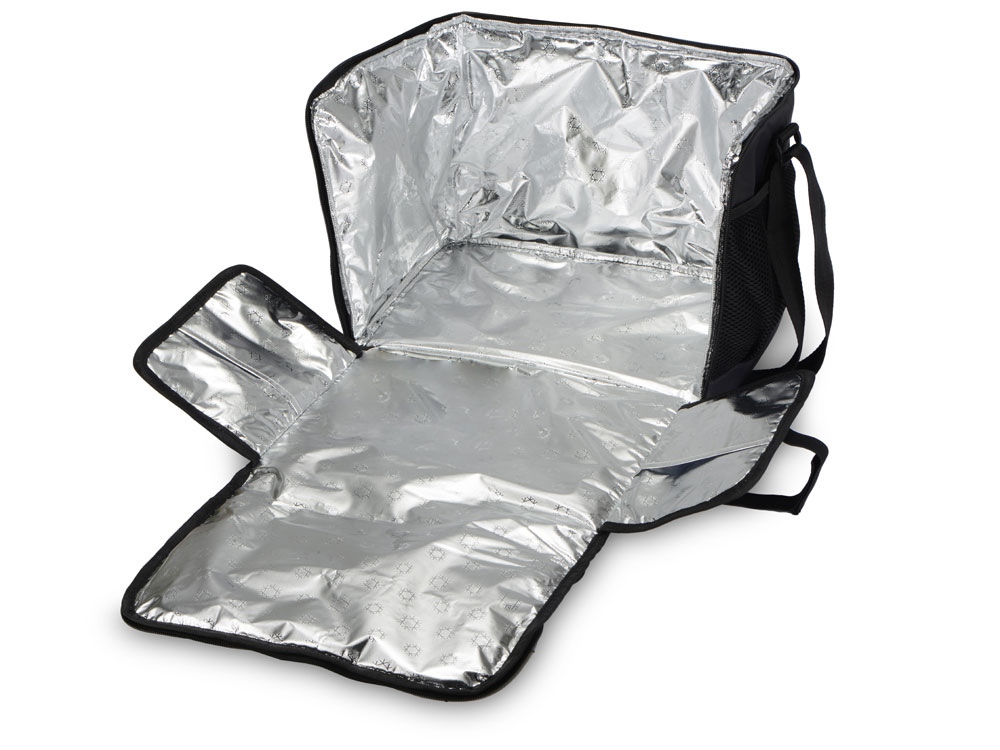 Раскладывается в удобное место для принятие пищи во время пикника на природе благодаря особой конструкции с молниями. Внутри карманы для всего необходимого и держатели на липучках для бутылок. Внутренняя подкладка из пены толщиной 3 мм. Широкая лямка регулируется по длине. 2 боковых сетчатых кармана.