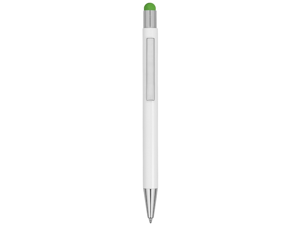 Металлическая шариковая ручка с нажимным механизмом и ярким стилусом.