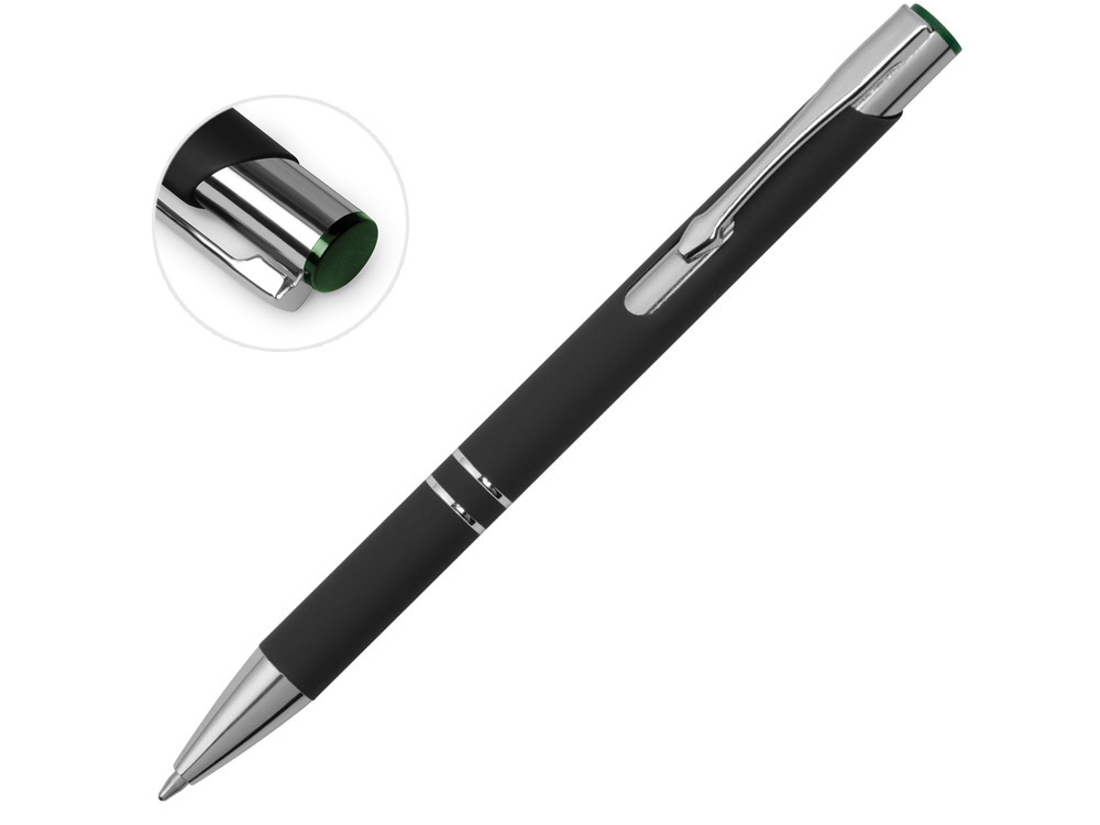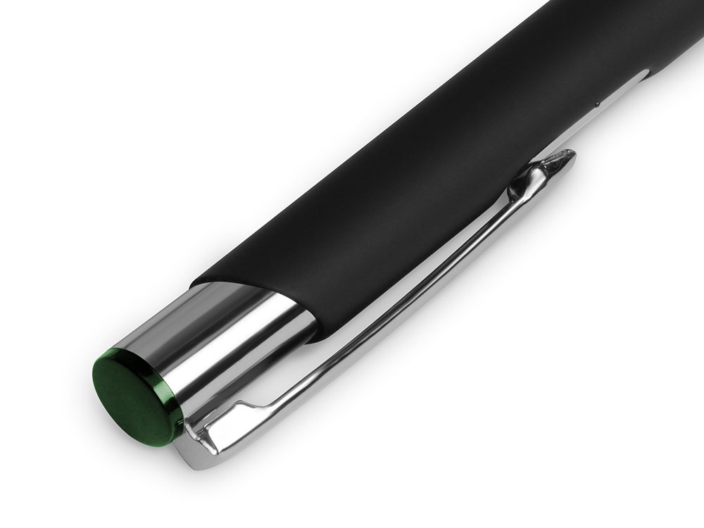 Черная шариковая ручка с кнопочным механизмом и тактильно приятным покрытием софт-тач. Цветная гравировка соответствует цвету кнопки и делает ее еще более изысканным подарком.