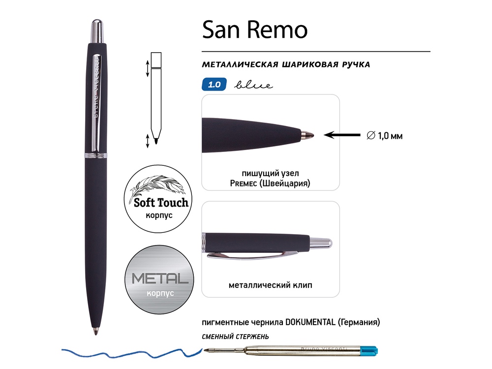 Металлическая шариковая ручка San Remo - аксессуар, призванный стать настоящим элементом стиля, подчеркнуть индивидуальность его владельца. Как и все подарочные ручки Bruno Visconti, San Remo - обладательница стержня с пишущим узлом от швейцарского производителя Premec и перманентными чернилами немецкого производителя Dokumental. Поэтому можно быть абсолютно уверенным в качестве письма. Сам стержень легко и бесперебойно выдвигается за счет мягкого нажимного механизма подачи. В ручке нет ничего лишнего, но она привлекает к себе внимание: изящна благодаря плавным линиям, эргономичному корпусу и приятна на ощупь, благодаря покрытию soft-touch. Контраст добавляют кольцо и клип из серебристого металла. Отличный бизнес-сувенир!