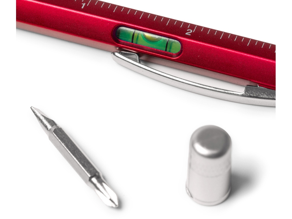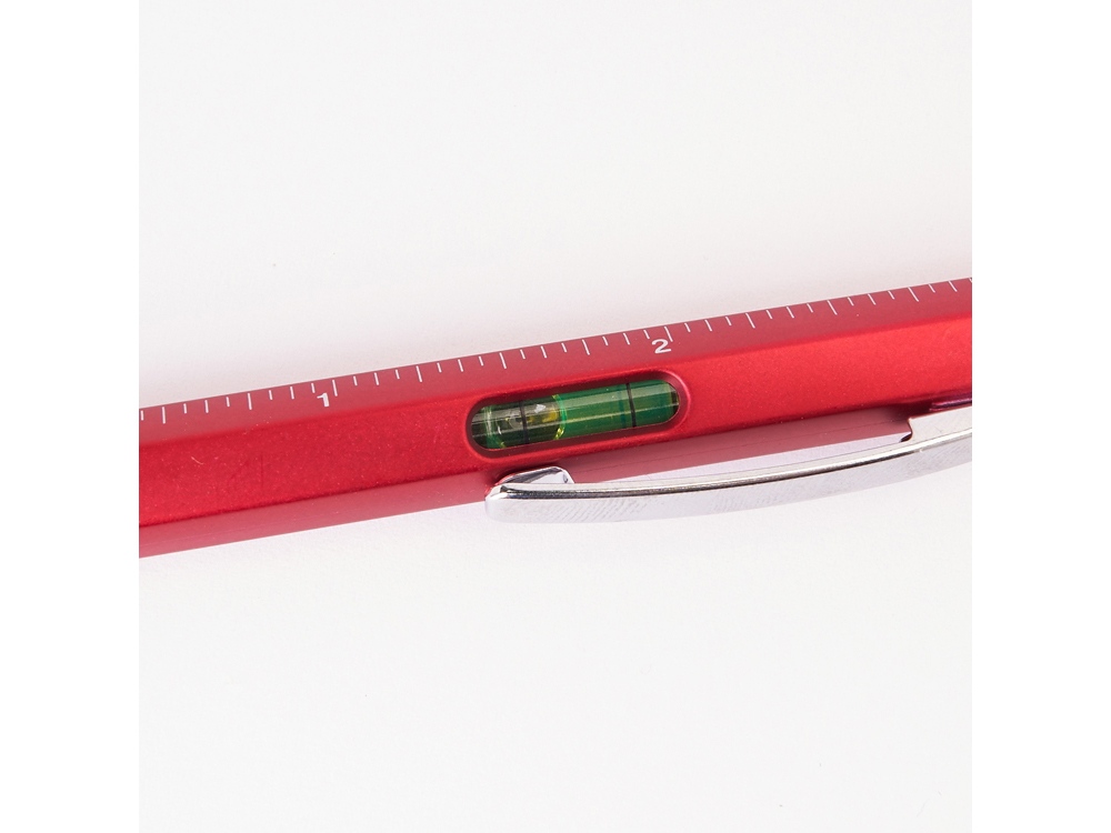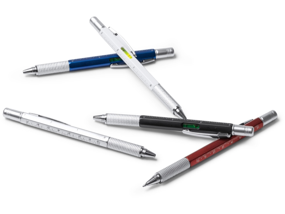 Многофункциональная ручка: уровень, сантиметровая и дюймовая линейка, плоская отвертка и звездообразная отвертка. Корпус доступен в различных цветах. Синие чернила.