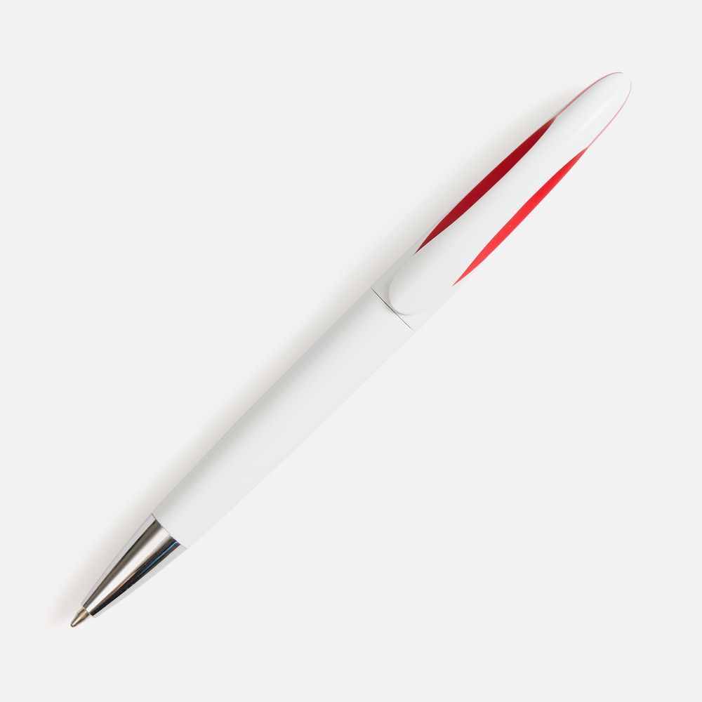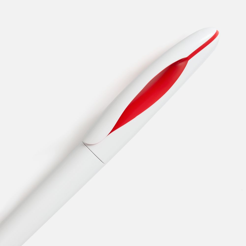Шариковая ручка приятных округлых форм с белым глянцевым корпусом и цветовым акцентом.