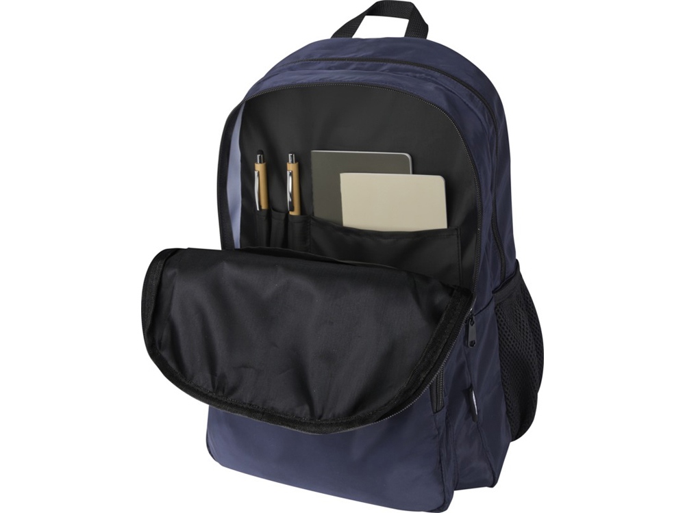 Рюкзак Trend Plus изготовлен из сертифицированной согласно GRS переработанной мягкой и немнущейся ткани и качественной подкладки из RPET. Рюкзак оснащен отделением для ноутбука диагональю 15, отделением-органайзером, передними карманами на молнии, боковыми эластичными сетчатыми карманами и сетчатой вентилируемой задней частью с лямкой для крепления к ручке чемодана. Регулируемые плечевые ремни для оптимального комфорта при ношении. Объем: 20 литр. Выдерживает вес до 10 кг. Не содержит ПВХ. GRS certified recycled polyester.