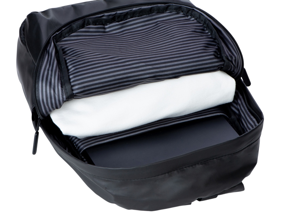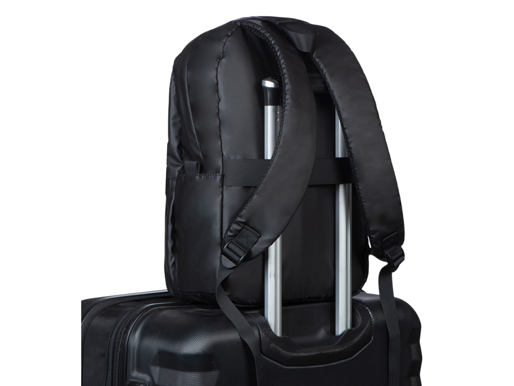 Элегантный легкий городской рюкзак из мягкого приятного на ощупь материала можно использовать для передвижений по городу, а так же в поездках, для чего на спинке предусмотрен ремень для крепления на ручку чемодана. Для удобства и компактного хранения содержимого снаружи расположены 2 передних кармана на молниях и 2 боковых кармана. Внутри уплотненный карман для ноутбука. Стильная подкладка в полоску в тон цвета внешнего материала делает рюкзак модным аксессуаром. Благодаря водостойкому материалу и молниям содержимое рюкзака не намокнет под дождем. Лямки регулируются по длине.