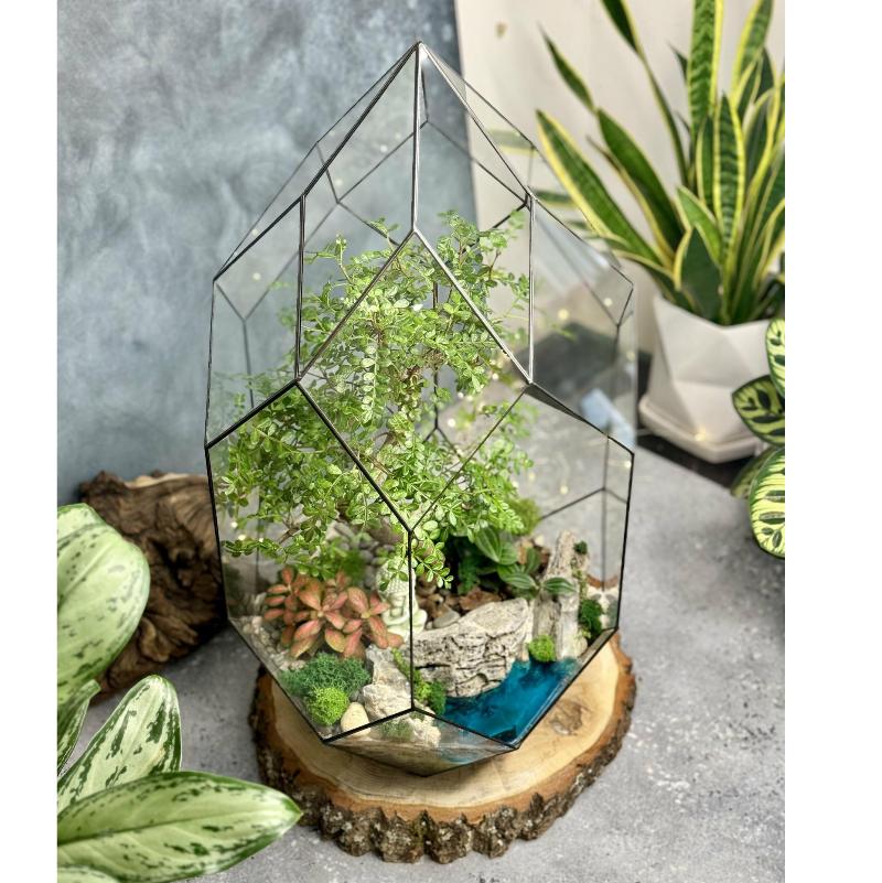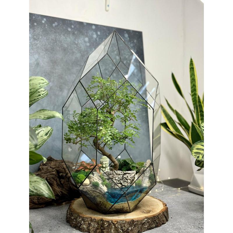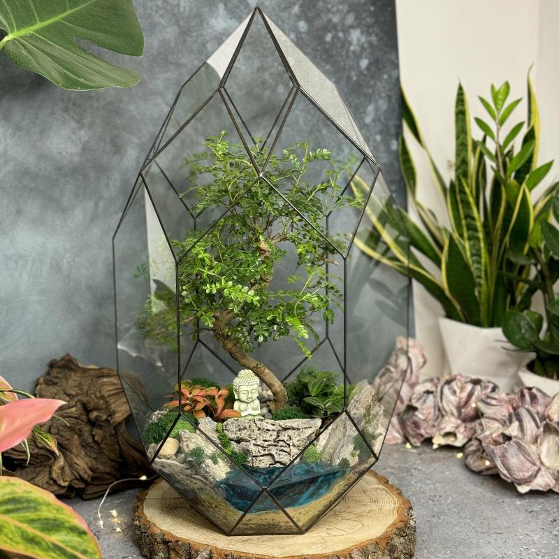 Для настоящих ценителей прекрасного отличным подарком к любому празднику станет вот такой флорариум. Бонсай, папоротники, фиттония, зеленый мох – все это сочетается в гармоничной симфонии зелени, а фигурка Будды настраивает на медитативный лад. Если ваша душа искала уголок, где можно отдохнуть и прийти в умиротворенное состояние в этом суетном мире – поздравляем, вы только что нашли этот уголок, который сможете установить как в комнате дома, так и украсить им свой офис.