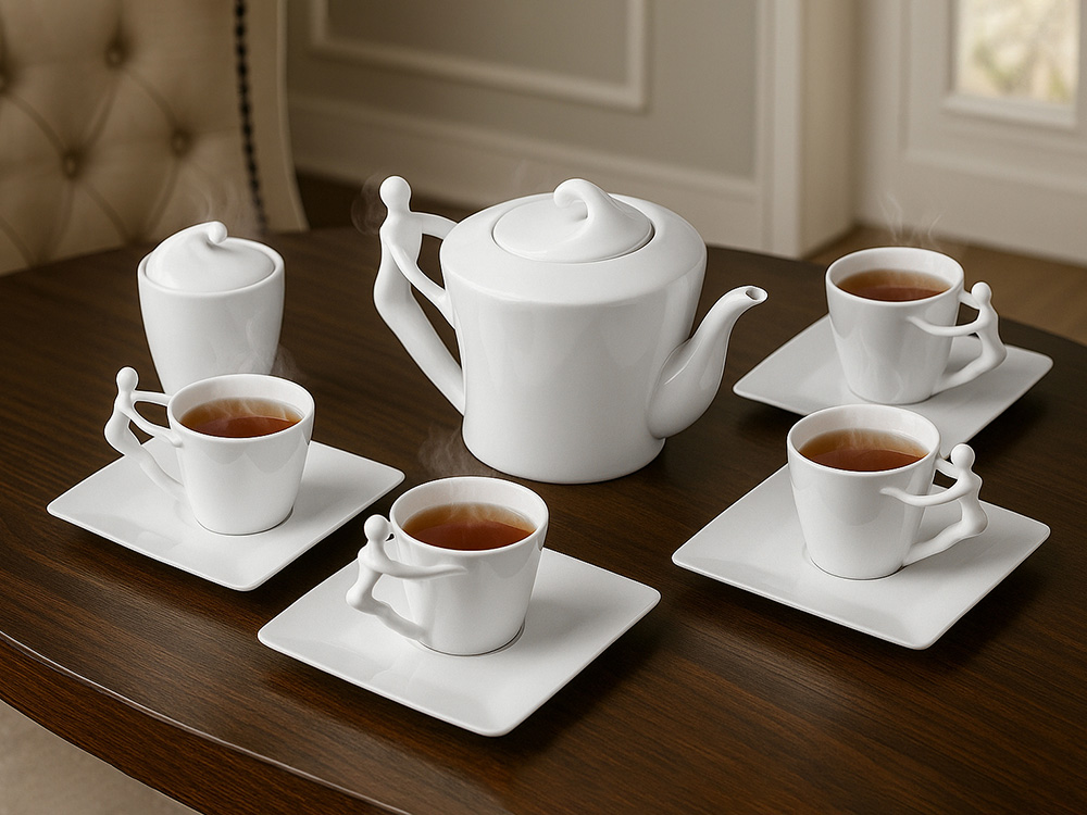 Это не просто посуда, а настоящее произведение искусства для вашего стола. Белоснежный сервиз создан для тех, кто ценит не только вкус, но и эстетику каждого момента. Уникальный дизайн: Ручки чашек и чайника выполнены в виде стилизованной фигуры человека. Это придает сервизу особый характер и глубину, превращая процесс чаепития в диалог с искусством. Полный комплект: В набор входит все необходимое: 4 чашки, 4 блюдца, чайник и сахарница. Эксклюзивная упаковка: Сервиз поставляется в деревянной коробке. Вы можете нанести на нее логтип или памятную надпись. Это готовая идея для безупречного корпоративного подарка. Универсальность и стиль: Белоснежный цвет и лаконичный дизайн делают сервиз уместным в любом интерьере — от классики до модерна.