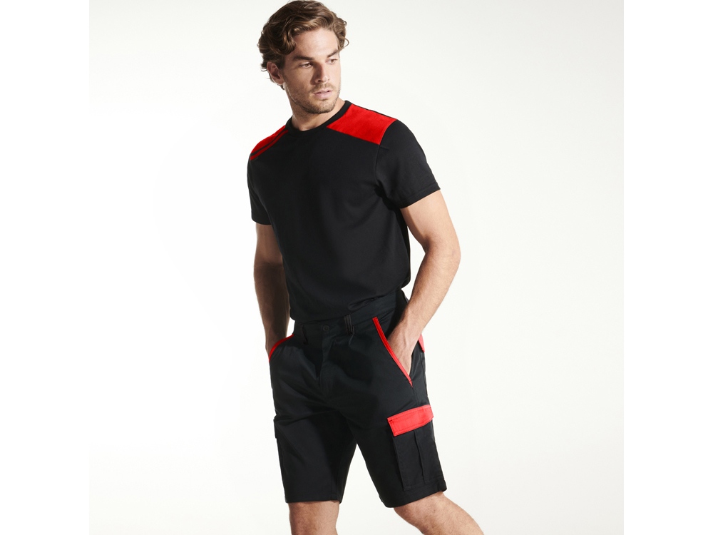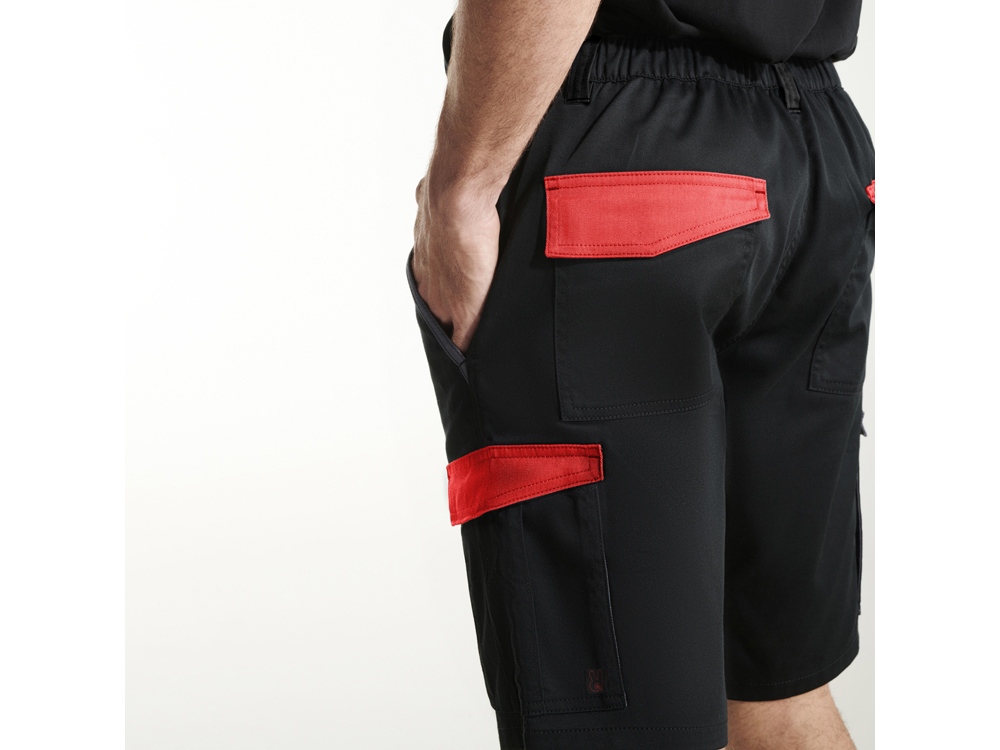 Шорты в двухцветной комбинации - Удобная и регулируемая ткань. - Контрастные петли для ремня, клапаны, складка и кант по краю кармана - Эластичный пояс сзади. - Два передних кармана. - Два задних кармана с клапаном и застежкой-липучкой. - Два боковых кармана со складкой и клапаном застегиваются на липучку.
