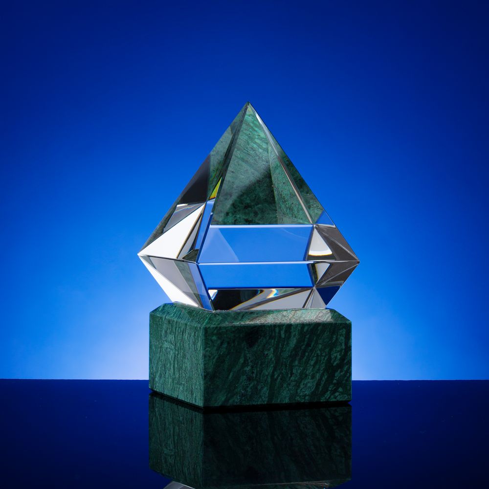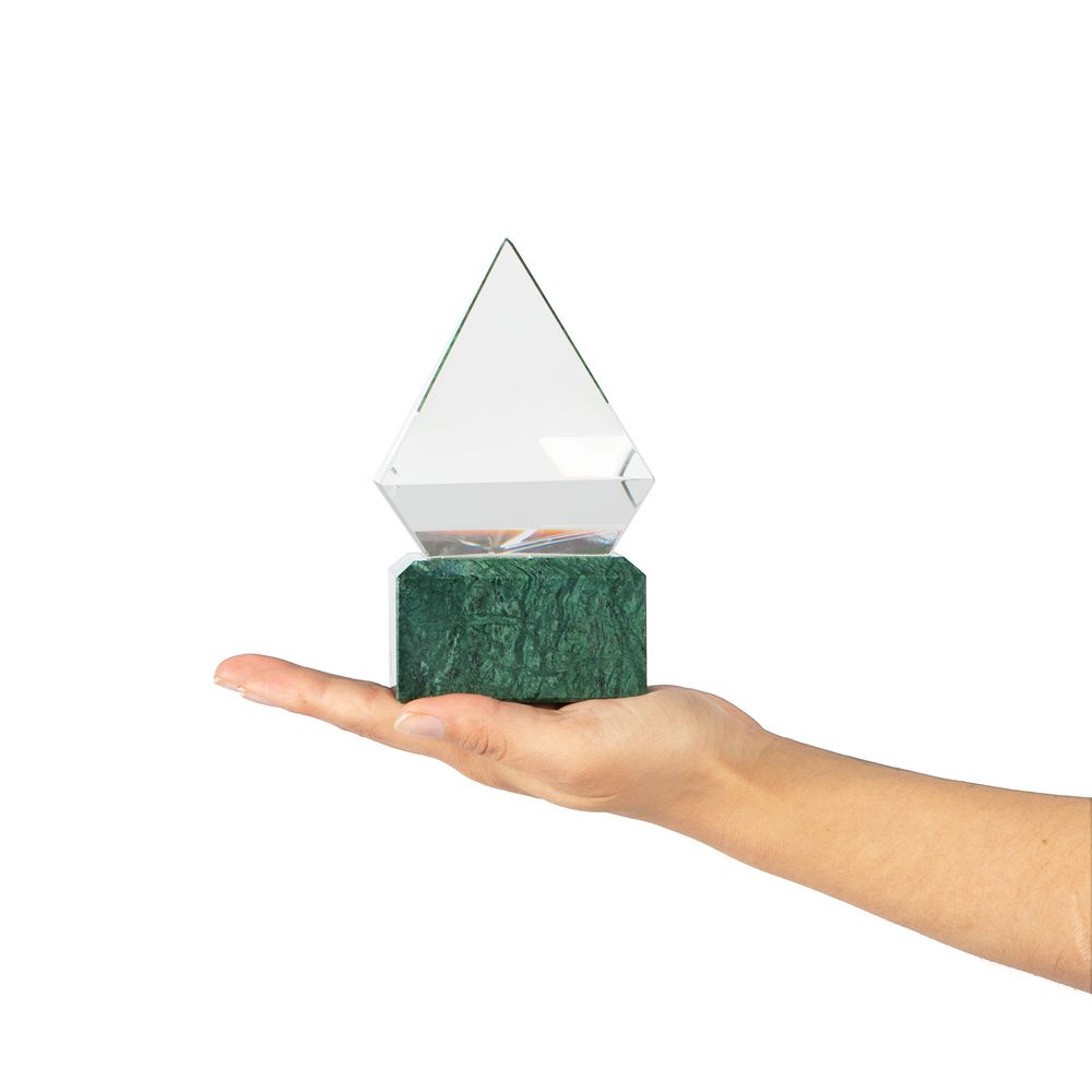 Эффектный камень серпентин благородного оттенка добавляет награде монументальности, а отражения в гранях стеклянного кристалла создают завораживающий визуальный эффект. Награда Picco подчеркнет грани успеха и таланта получателя, а также вдохновит на покорение новых вершин. Благодаря своей форме и исполнению награда Picco займет достойное место в коллекции и украсит любой интерьер.