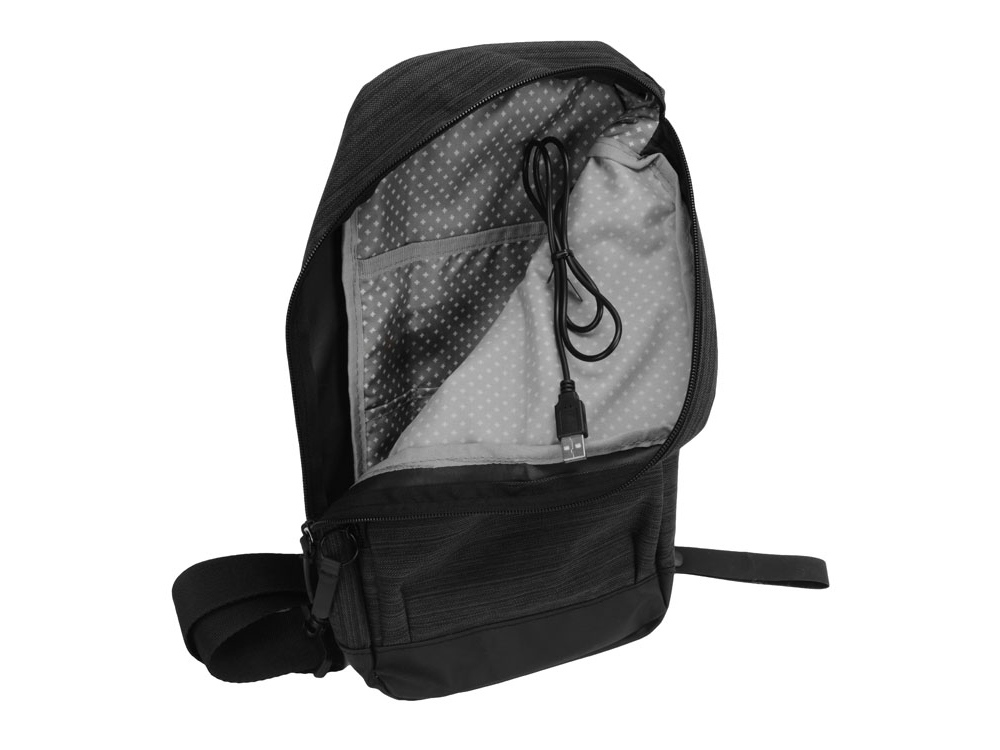 Удобная и легкая сумка на одно плечо незаменима для переноски всего необходимого. - карман на молнии на лямке для карт, - фиксация лямки для ношения слева или справа, - регулируемая по длине лямка 145 см, - сетчатая дышащая спинка, - USB порт, - ремешок из PU для дополнительного удобства, - в большом отделении: карман для планшета, органайзер, наружный карман с сетчатым карманом внутри.