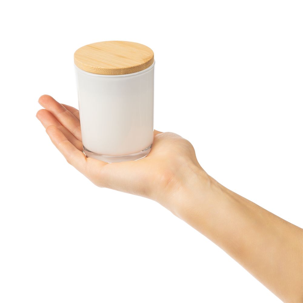 Материал свеча - воск, кокосовый, парафин; подсвечник - стекло; крышка - дерево; фитиль - дерево