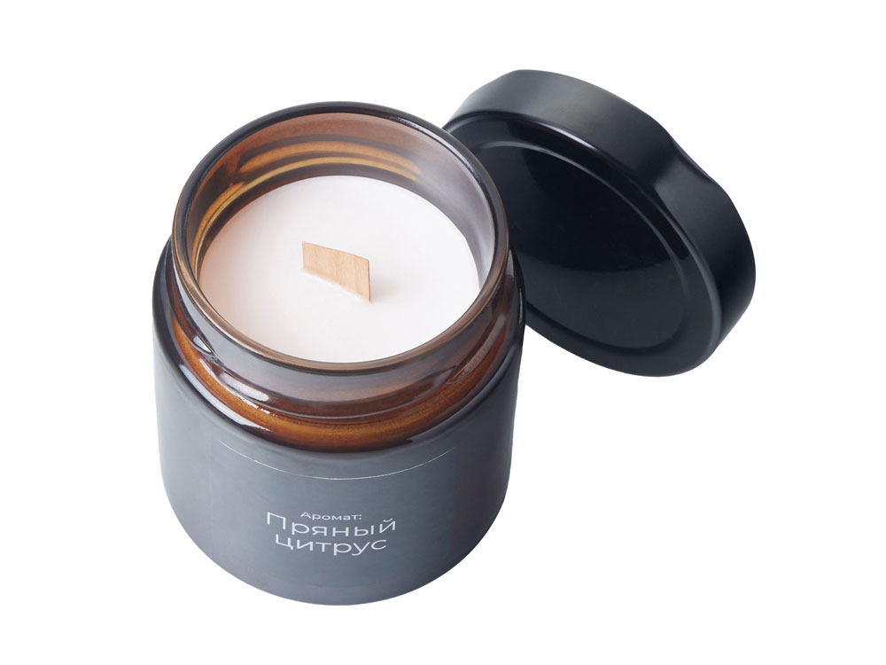 Свеча в стеклянной коричневой банке 200мл, аромат Пряный цирус, фитиль деревянный купить оптом и в розницу с нанесением логотипа в Москве