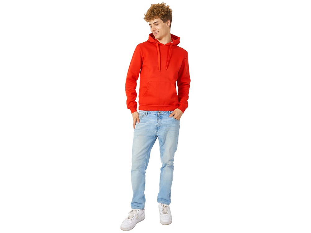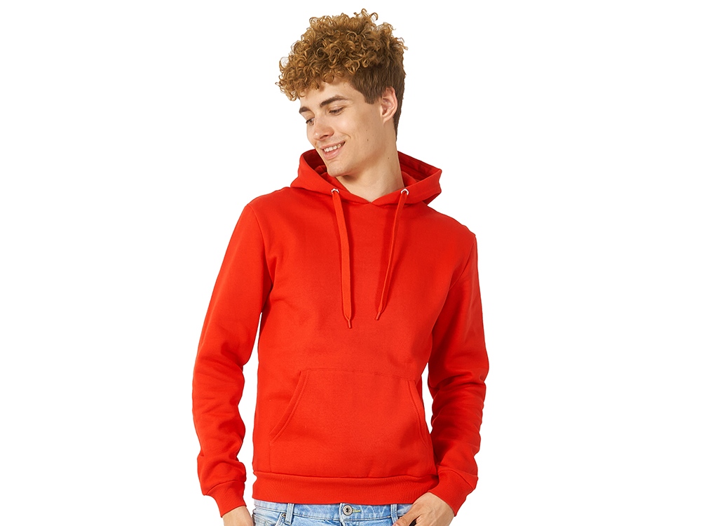 Толстовка с капюшоном (худи) из плотного футера с мягким начесом, с небольшим добавлением полиэстера. Удобная и практичная модель, подходит для прогулок по городу, активного отдыха, путешествий. • Прямой силуэт. • Капюшон с подкладкой в цвет основного материала, металлическими люверсами и плоским шнурком с наконечниками. • Удобный карман-кенгуру. • Долго сохраняет форму и не мнется благодаря небольшому содержанию полиэстера. • Гигроскопичное волокно, обладает хорошими гигиеническими свойствами. • Низ толстовки, рукавов и горловины обработаны рибом (резинкой) 1x1.