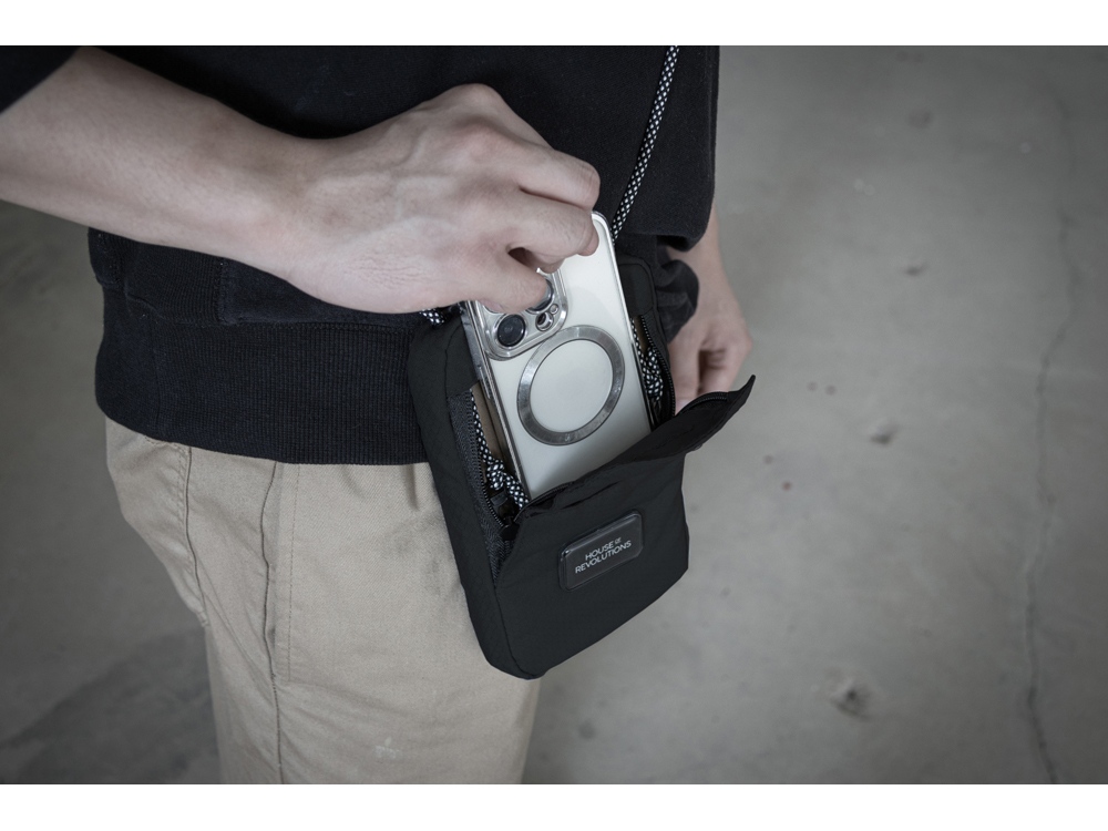 Компактная и легкая сумка для телефона и мелочей создана из прочного водоотталкивающего переработанного полиэстера, стойкого к загрязнению. Этот аксессуар станет незаменимым корпоративным подарком. В сумку войдет все, что все привыкли хранить в карманах. Удобная фиксация кармана быстрого доступа на магните позволяет легко открывать сумку. Основное отделение для телефона, бумажника, наружный карман и задний карман на молнии для ключей и карточек позволяют рационально организовать пространство. Шнурок регулируется по длине (max 95 см), поэтому сумку можно носить на плече, в руке или на шее. В комплекте съемный металлический шильд под нанесение вашего логотипа.