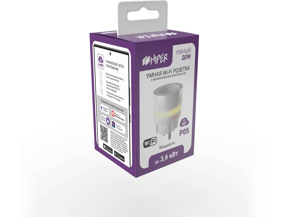 Умная розетка HIPER IoT P05 рассчитана на работу с мощными электроприборами (до 3,6 кВт), LED подсветкой корпуса и функцией мониторинга энергии. Предназначена для удаленного включения/выключения электроприборов, а также для поддержки исполняемых сценариев. К ключевым особенностям модели можно отнести: • Подходит для работы с мощными электроприборами. Максимально допустимая сила тока 16 А, мощность до 3,6 кВт. • Подсветка корпуса. Для удобства и безопасности, корпус розетки подсвечивается и ее легко обнаружить в темноте. • Поддержка голосовых помощников Яндекс Алиса и Google Home. Управлять включением/выключением данной розетки возможно через голосовых помощников в умной колонке, телефоне или планшете. • Установить и настроить просто. Чтобы установить эту розетку, достаточно ее воткнуть в действующую розетку и настроить в соответствии с инструкцией. • Удобство настройки сценариев HIPER IoT. Простая и интуитивно понятная настройка сценариев. • Поддержка облачных технологий. Благодаря облачным технологиям устройства умного дома от HIPER, могут работать без управляющих модулей, достаточно лишь подключить устройство к приложению и обеспечить доступ к Wi-Fi и Internet. • Безопасность и дистанционное включение/отключение. Для удаленного выключения/включения необходимо обеспечить подключение розетки к WiFi и смартфона/планшета к интернету. • Мониторинг потребляемой энергии. В приложении есть возможность отслеживать статистику потребления электроэнергии приборами, подключенными к данной розетке. • Включение/выключение по расписанию. Розетку можно включать и выключать по графику, в том числе по таймеру обратного отсчета и по расписанию. • Сохранение режима on/off при выключении электроэнергии. В случае отключения электричества, при появлении электроэнергии в сети, розетка сама восстановит тот режим, что был на момент выключения.