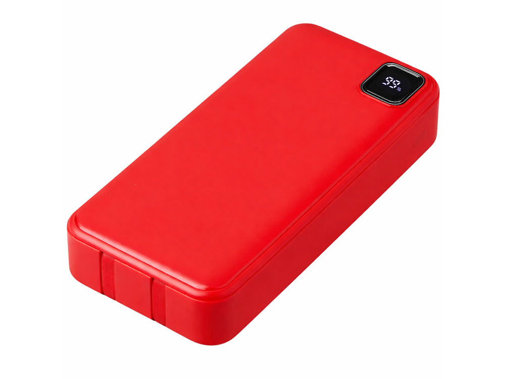 Удобный внешний аккумулятор с функцией быстрой зарядки и встроенными кабелями USB-C (симметричный разъём USB тип С) и Lightning (разъём в ранних версиях iPhone) — ваш надежный партнер в путешествиях, на встречах и в повседневных задачах. Цифровой дисплей в реальном времени показывает точный остаток заряда и статус быстрой зарядки, а встроенные кабели и несколько разъемов позволяют заряжать до 4 устройств. Прочный корпус из переработанного АБС-пластика и емкость 20000 мАч обеспечивают зарядом все ваши устройства на долгий срок. Идеальный выбор для тех, кто ценит комфорт и функциональность в одном устройстве. Продуманная упаковка: для открытия просто потяните за язычок, и появится гаджет с нанесением. - Встроенные кабели USB-C и Lightning — больше не нужно искать провода - Цифровой дисплей с точным отображением заряда - Удобная зона под нанесение логотипа - Функция быстрой зарядки, заряжает на 50% быстрее - Упаковка с удобным и быстрым открытием - До 4-5 полных зарядок смартфона