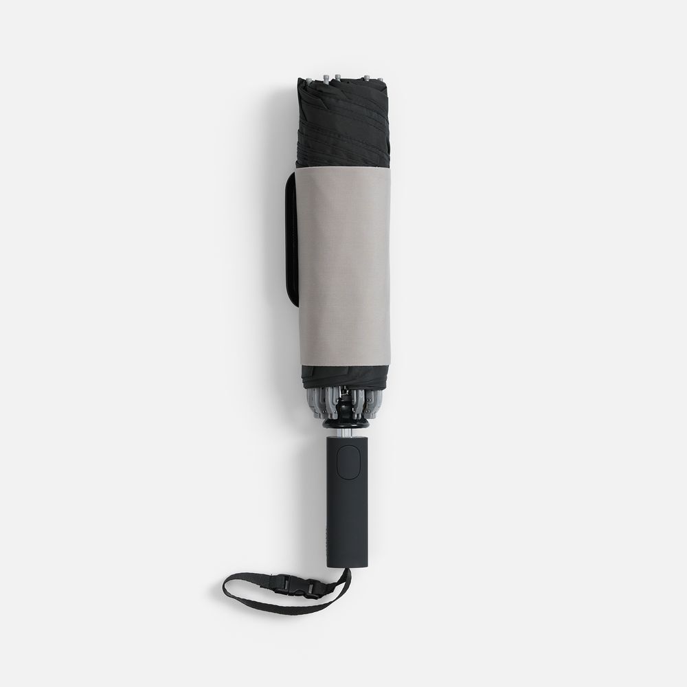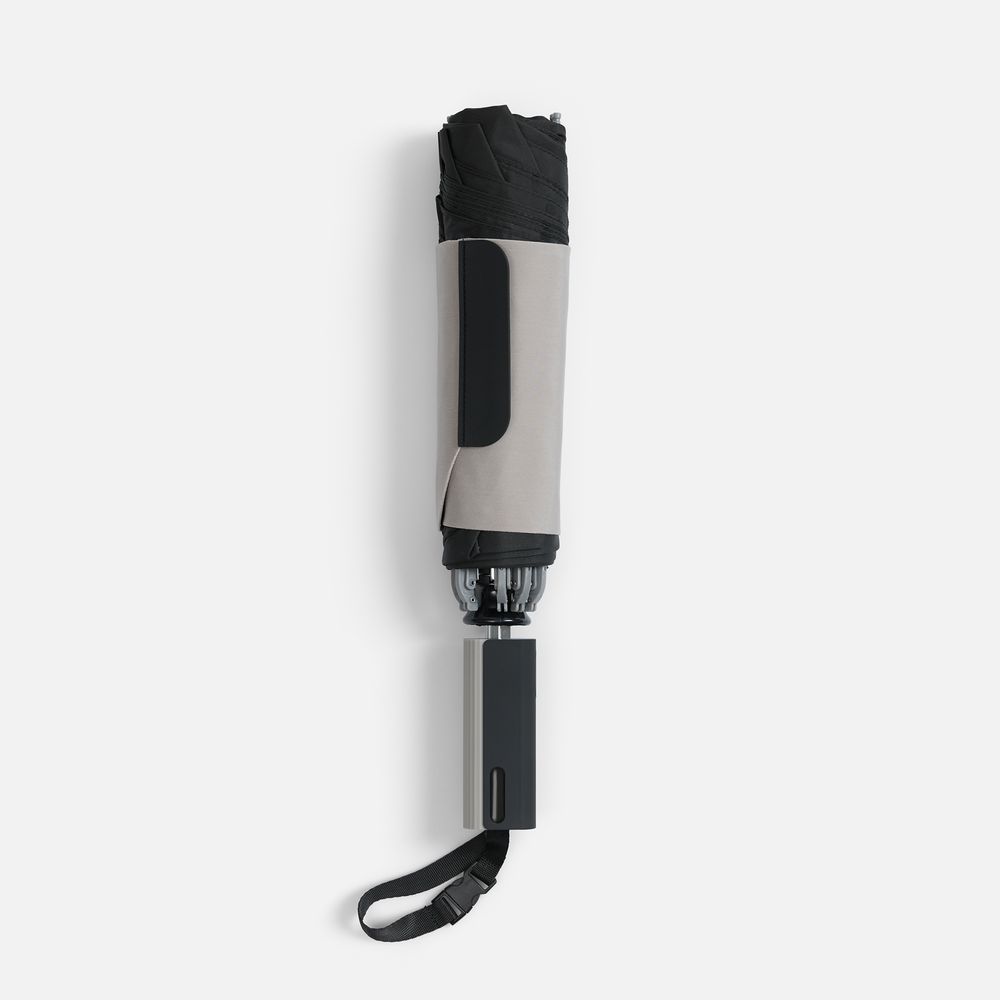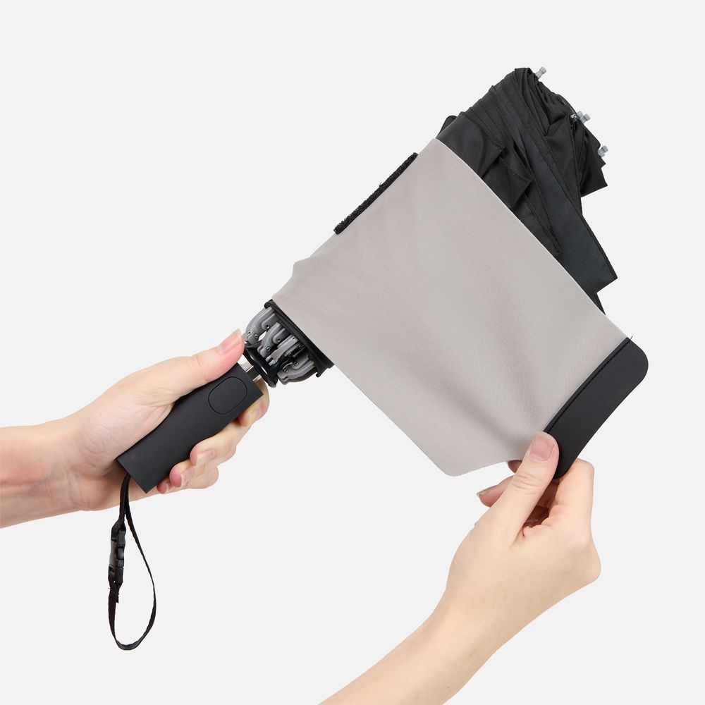 Складываясь после дождя, он прячет мокрую поверхность внутри, а сухая остается снаружи — в закрытом положении зонт не побеспокоит окружающих и не намочит одежду. Благодаря застежке на ремешке, зонт удобно подвесить, например, на рюкзак.
