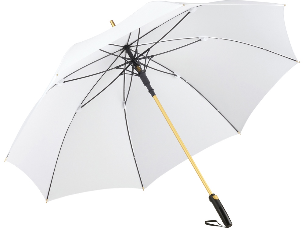 Зонт-трость с большим куполом укроет от дождя двух человек. Каркас изготовлен из особо прочного алюминия. Детали из алюминия окрашены в популярные цвета и стильно выглядят. Зонт плавно раскрывается нажатием кнопки на ручке. В ручку интегрирован эластичный шнур для большего удобства.