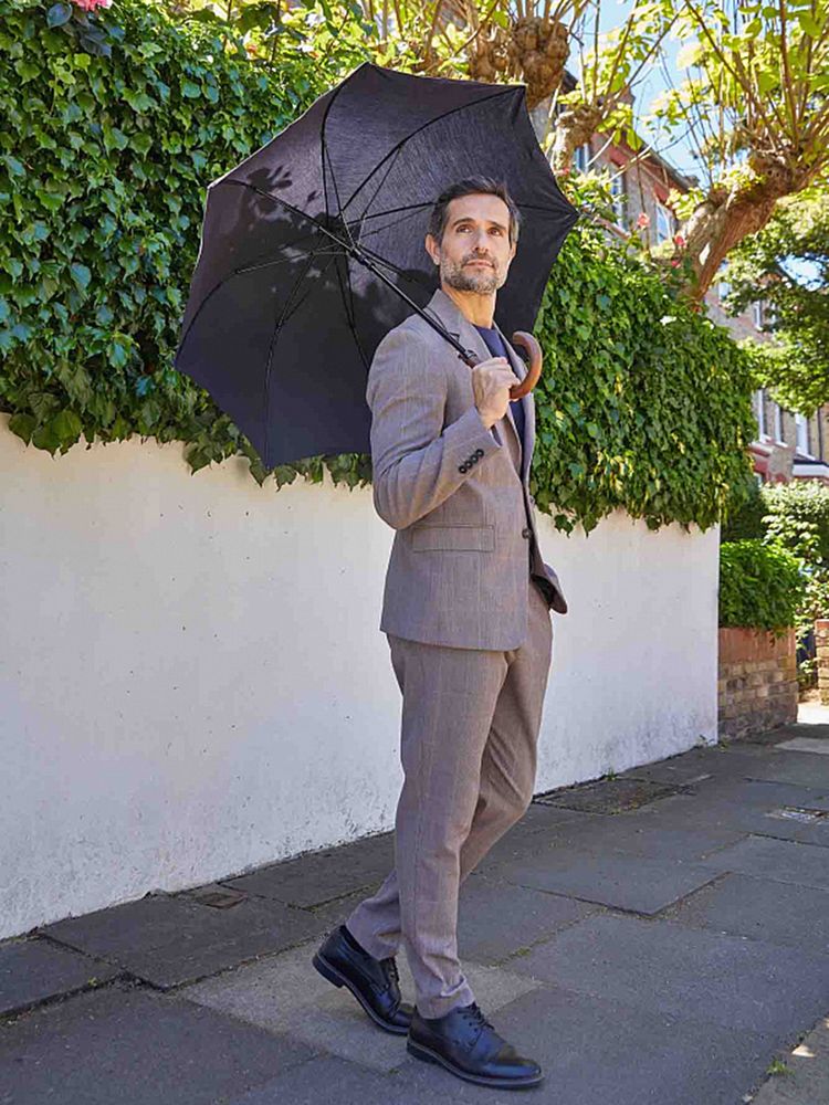 Большой фактурный купол сделан из люксового поликоттона и очень красиво и необычно смотрится на свету. Деревянная рукоятка с металлическим кольцом, под которое заправляются спицы, добавляет престижа и изящества.